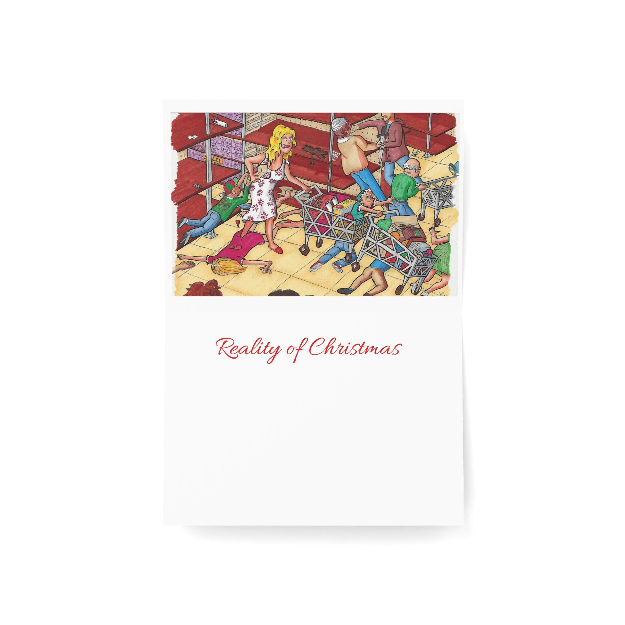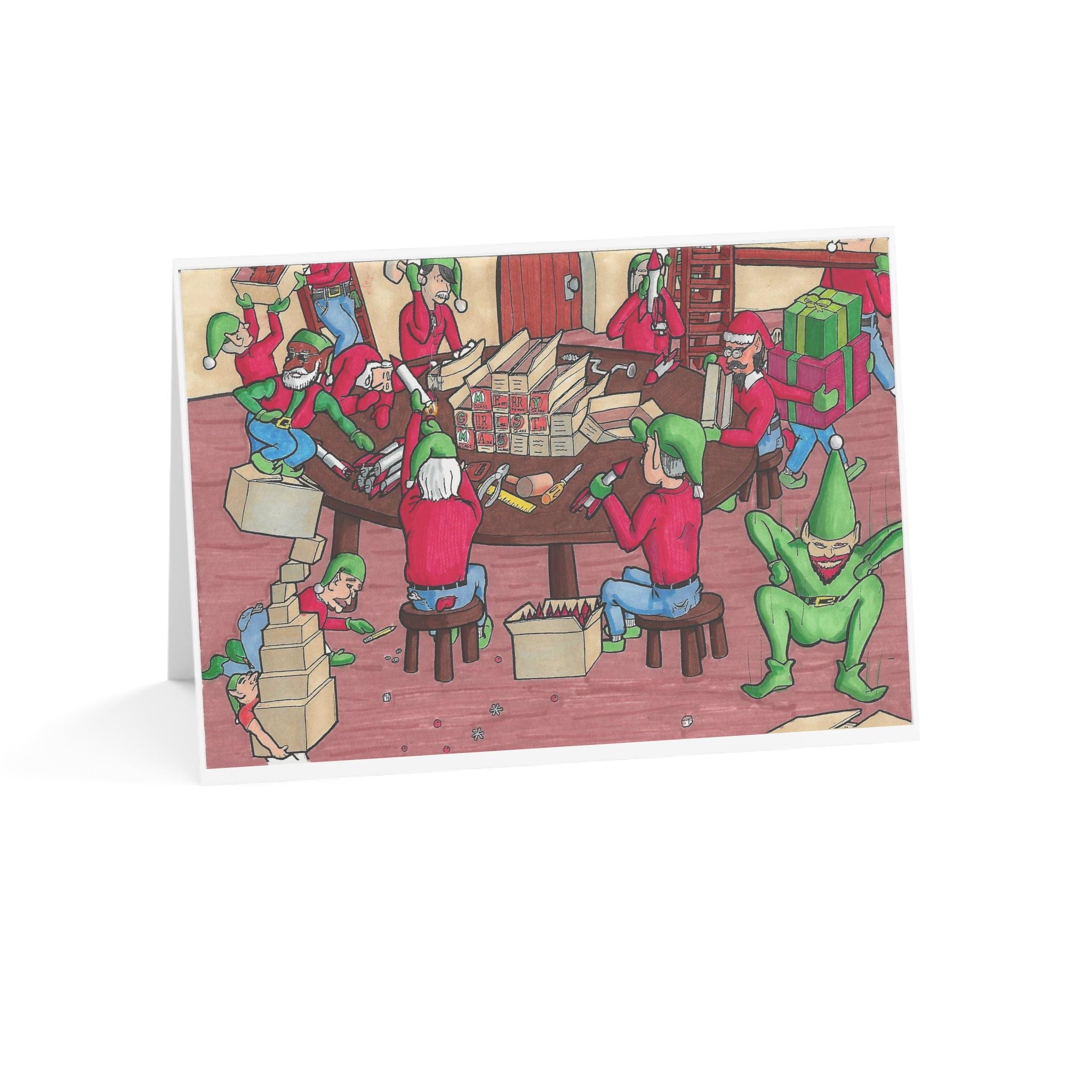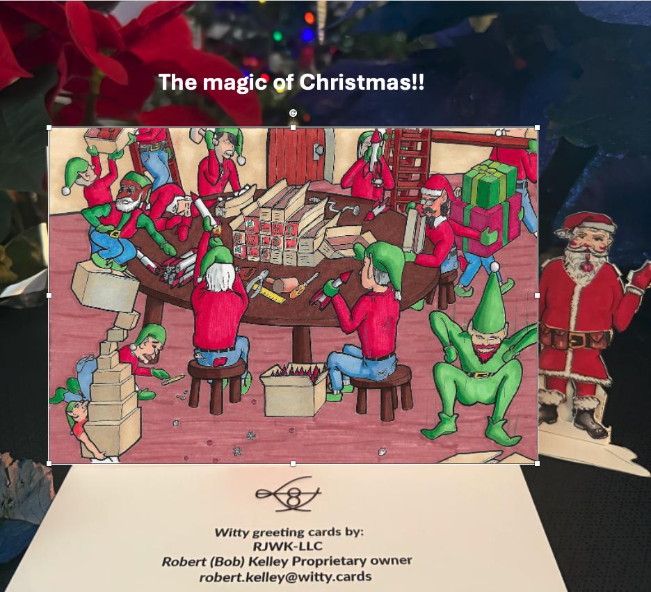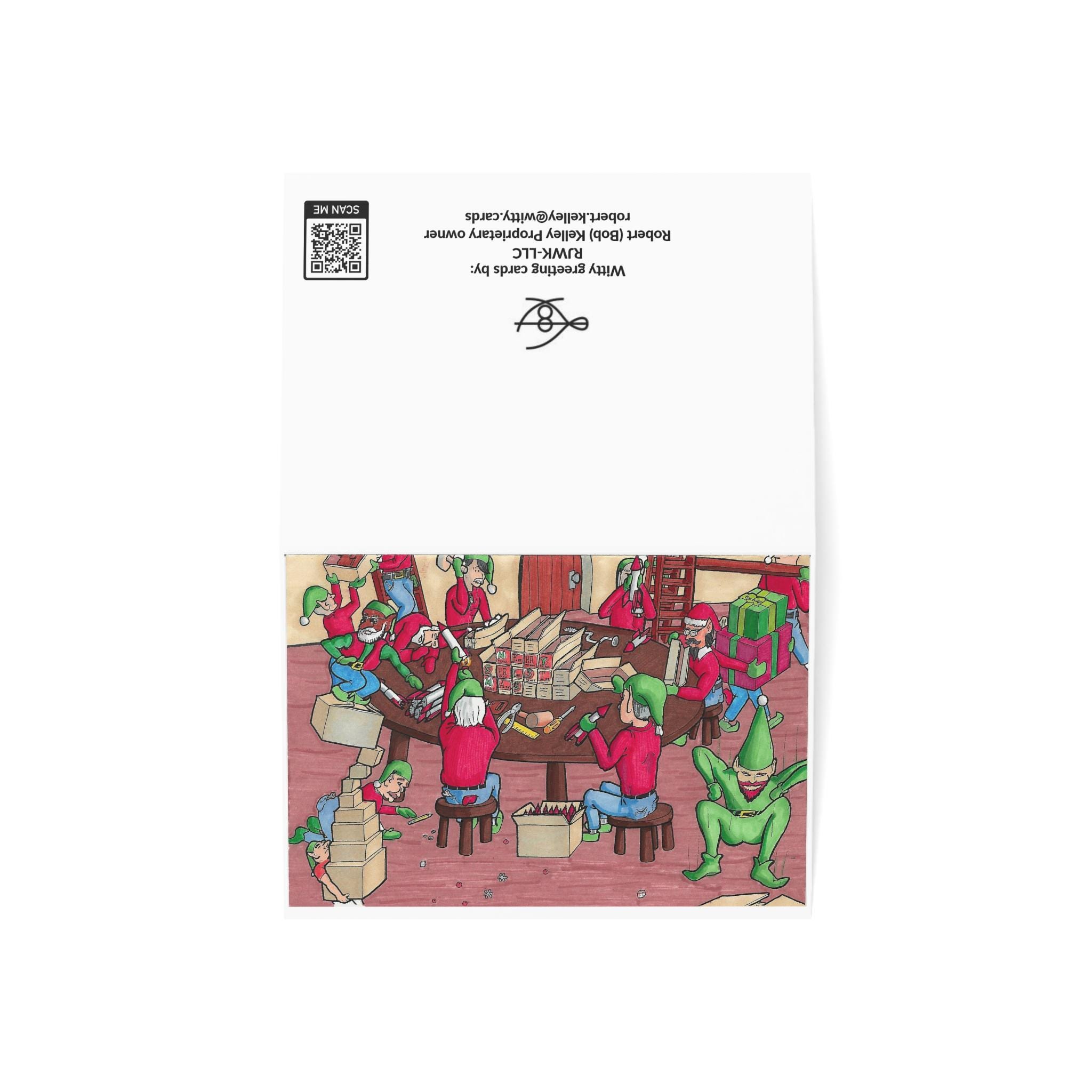 On the outside, elves wearing mittens are merrily making toys and packing them into boxes. The fact that they are wearing mittens and only have basic tools does not hinder them in any way. Inside, the card shows a little more realistic view of the magic of Christmas, mom fighting another shopper for the last of a "got-to-have" toy. With the shelves almost empty, people are fighting and scrambling, and running into each other with reckless abandon to get a toy to make their kid happy.