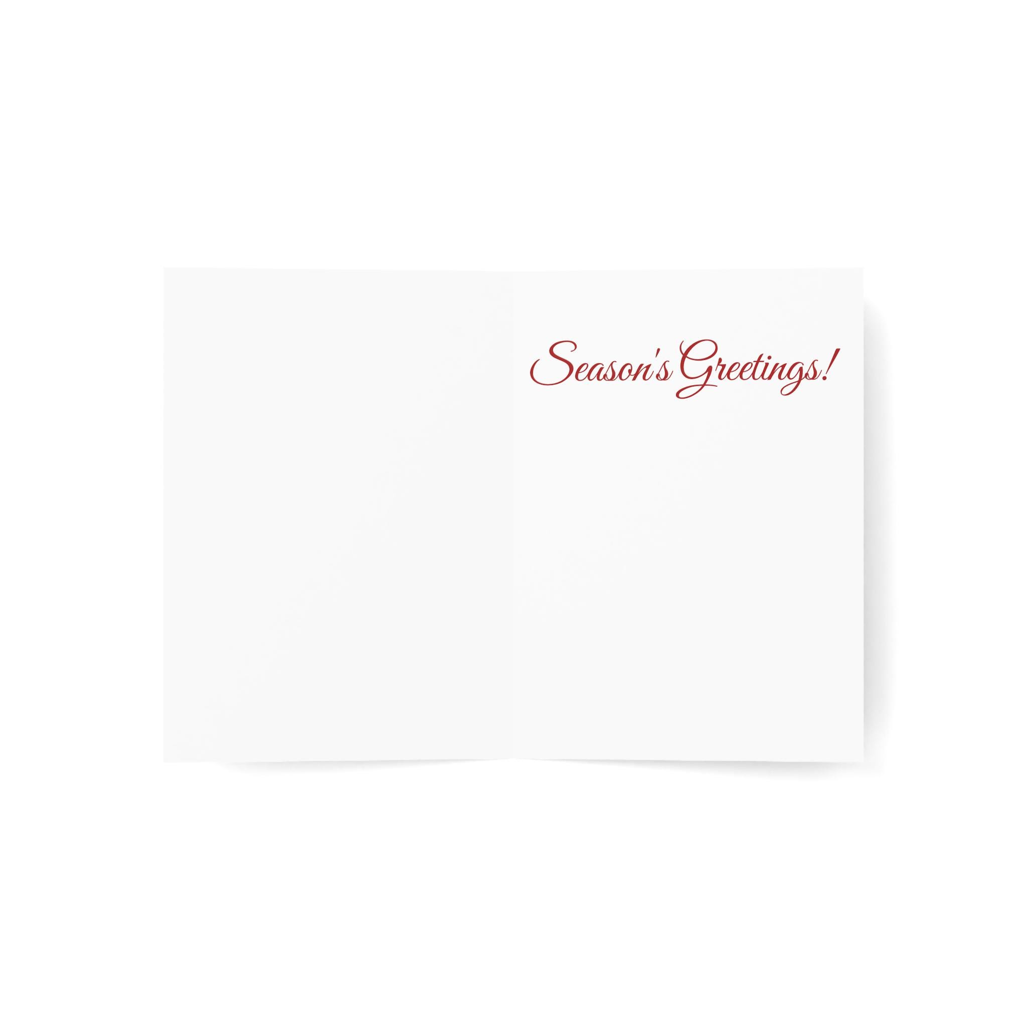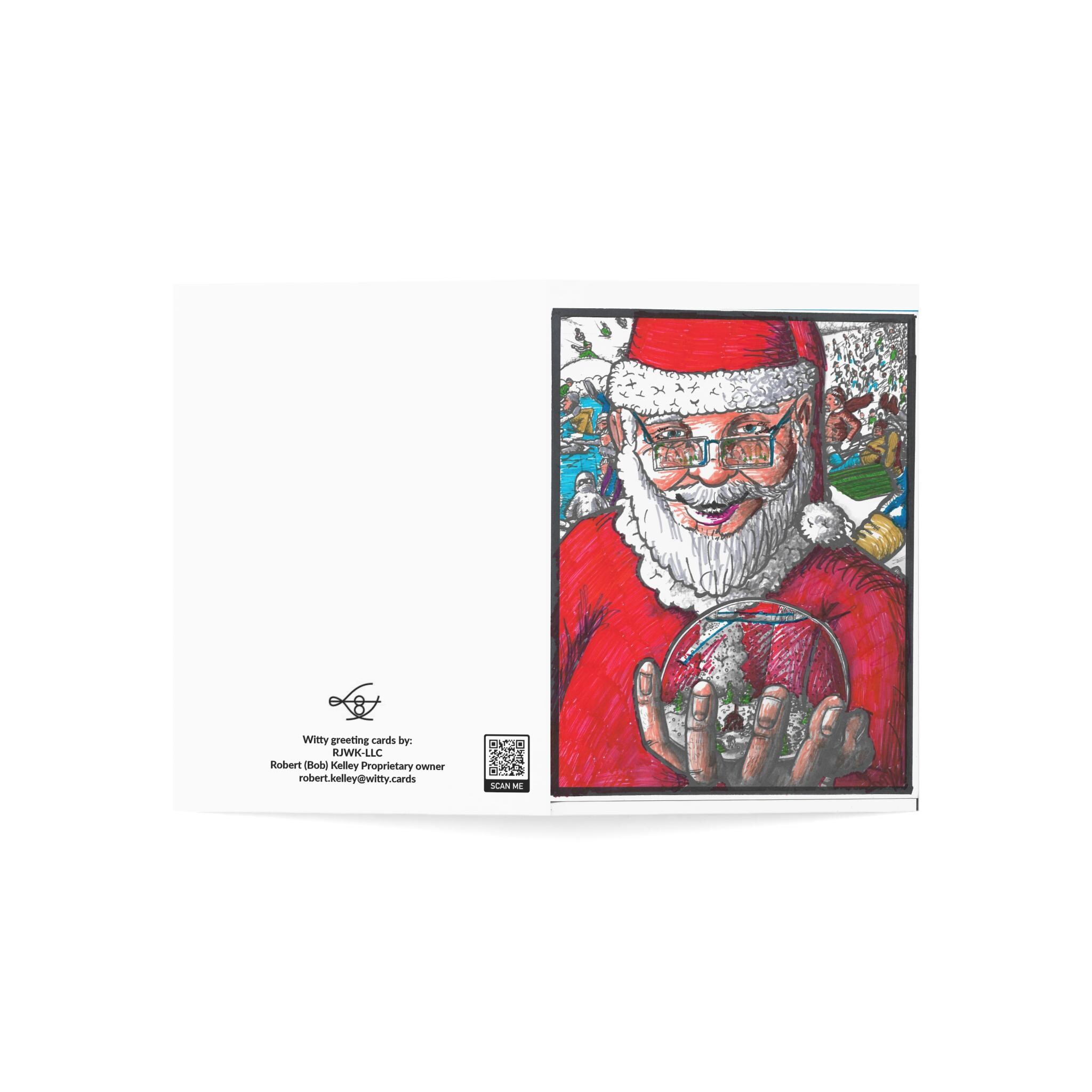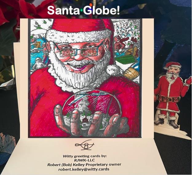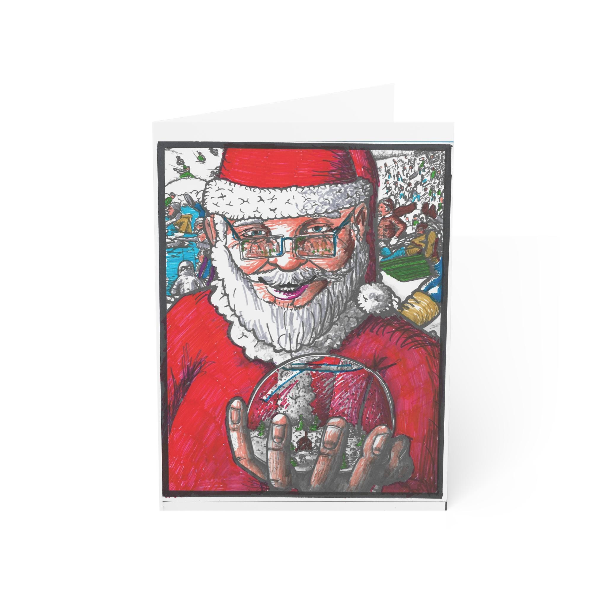 A hand-drawn holiday horizontal card depicting What the 3 children (in last years card), Looking at the snowglobe were seeing. The children were looking at the Santa Claus holding the snow globe!