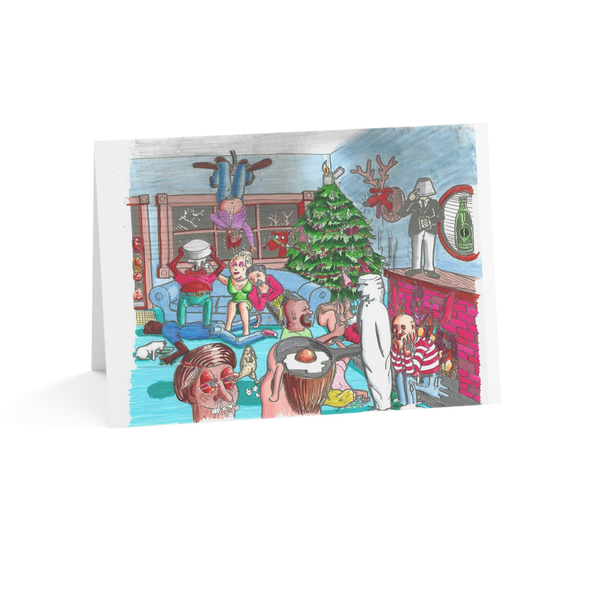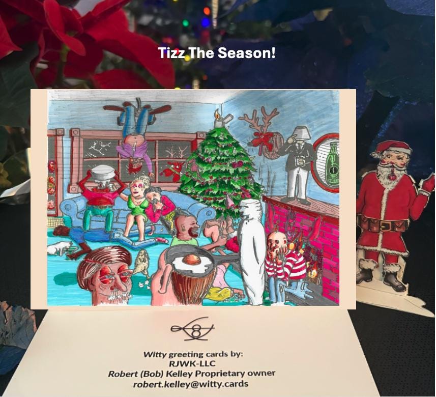 The artwork on the card is original and drawn and colored by twins Robert and Randy Kelley, along with Jeff Wallace, and Pablo Rodriguez. The Christmas Card depicts a Christmas party happening in the 1980’s. Sex, drugs a little violence and definitely allot of munchies!